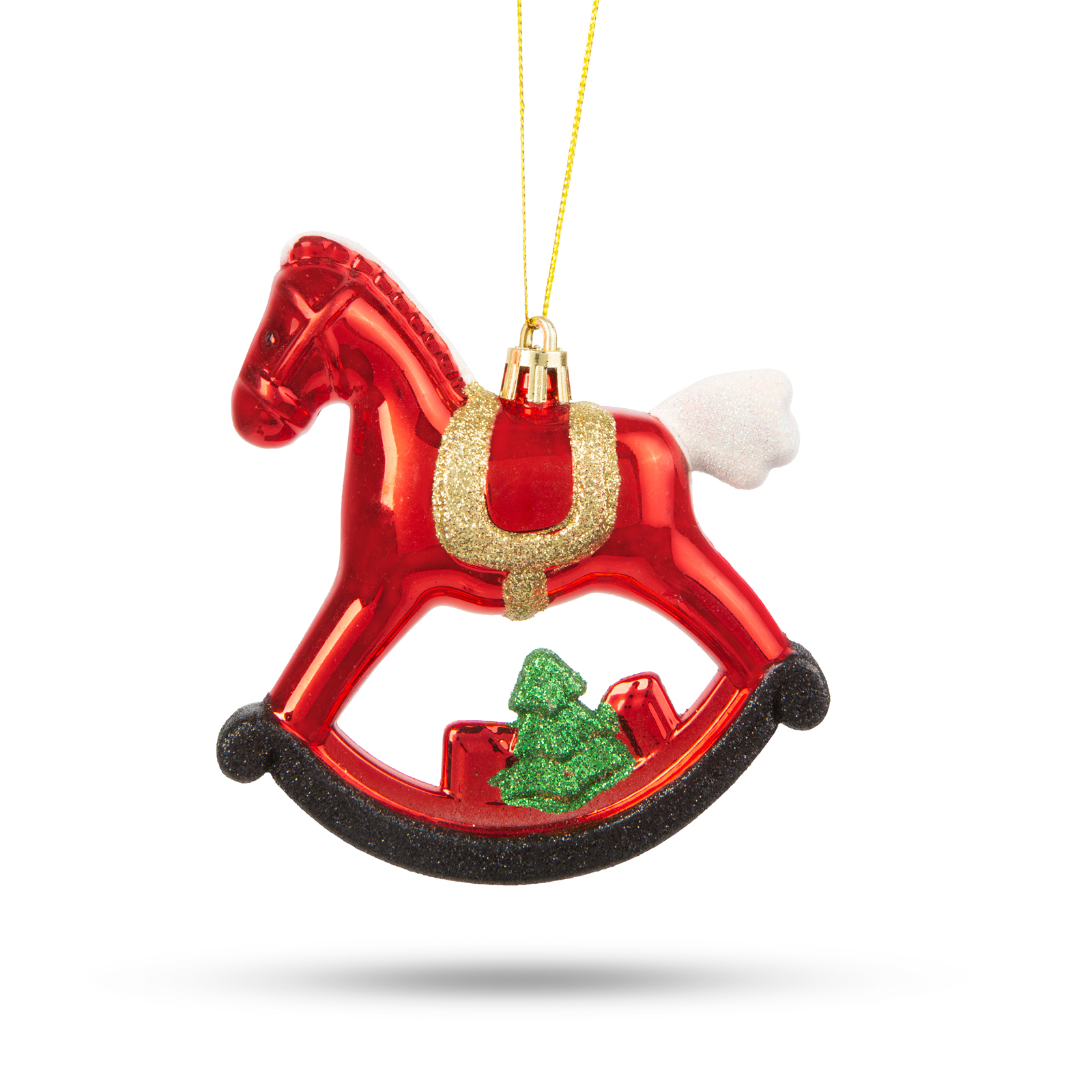 Ez a különleges karácsonyfa dísz egy csillogó hintalovat ábrázol, amely kiválóan mutat minden karácsonyfán és meghitt ünnepi hangulatot varázsol az otthonába. A dísz különleges glitteres, fényes bevonattal van ellátva, amely gyönyörűen ragyog a karácsonyi fényekben.