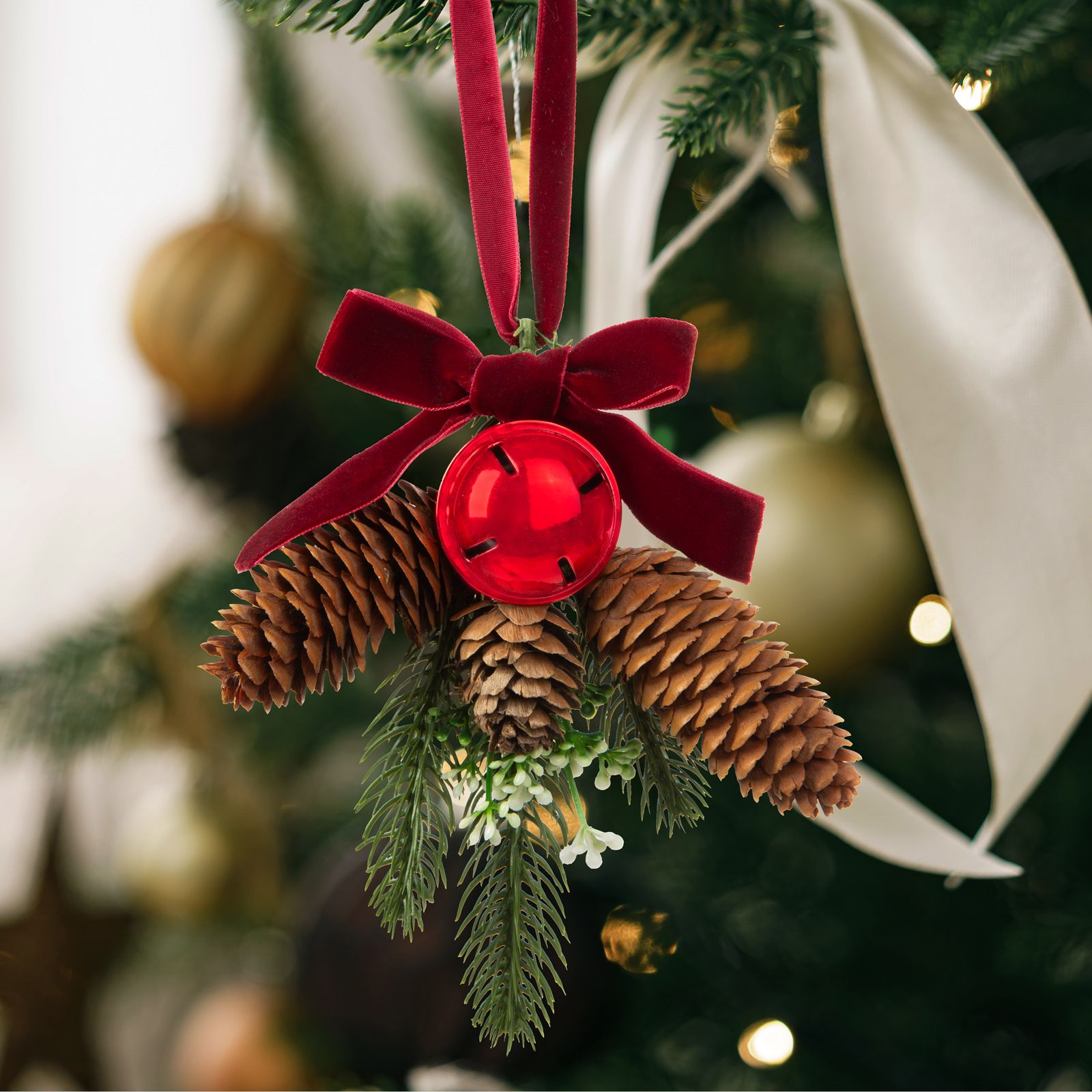 Karácsonyi ajtódekoráció - műfenyő, tobozzal, piros gömbbel - 16 x 15 cm