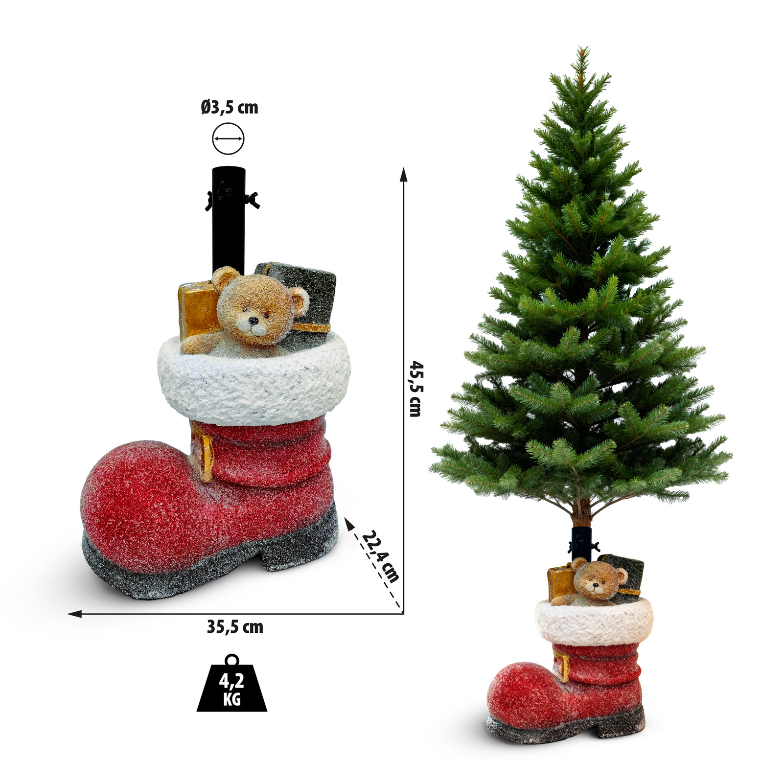 Ez a mikuláscsizma formájú karácsonyfa talp nemcsak praktikus, de dekoratív eleme is lehet a karácsonyfának. A piros színű, fehér felső résszel díszített csizma élethű lábbeli benyomását kelti, miközben stabilan tartja a karácsonyfát. A műkőből készült talp erős tartást biztosít nagyobb méretű fák esetén is.